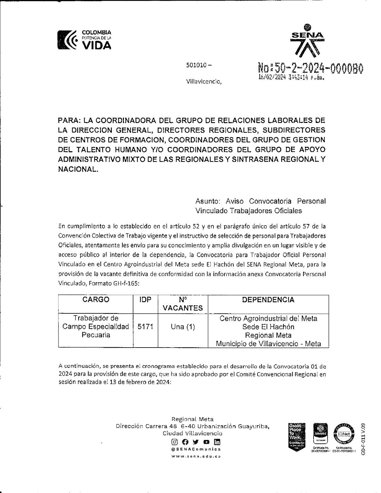 Convocatoria Interna Personal Vinculado Centro Agroindustrial del Meta